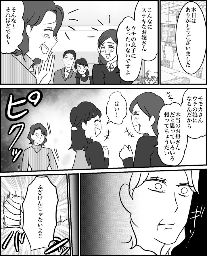 結婚の挨拶が終わると、モモカちゃんを含めて全員が帰っていきました。一緒にいるのは私だけという空間で、義母はさっそく怒りをあらわにします。「ウチの娘になるんだから」という先方の言葉が心底許せなかったようです。