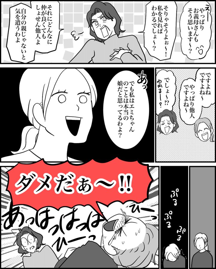 「でも私はエミちゃんのことは、本当の娘だと思っているわよ?」その瞬間、私は一瞬止まってしまいました。けれど次第に笑いがこみ上げてきたのです。義母が思った以上のダブスタをかましてきたので、面白すぎて大爆笑してしまいました。