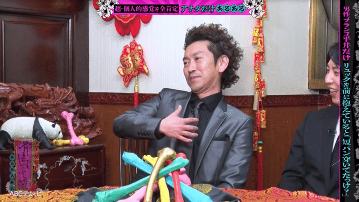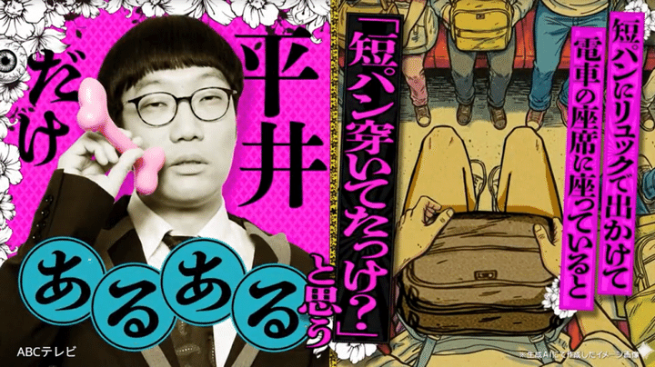 暴露のきっかけは、男性ブランコ・平井まさあきの「短パンにリュックで出かけて電車の座席に座っていると、『短パン穿いていたっけ?』と思う」というエピソード。毎回平井は、「俺パンツ(だけ)で来ている?」という不安でいっぱい。リュックを普通にどけて確認する勇気を持てず、モゾモゾ動いて尻の感覚だけで探り、最終的には観念して、周囲に見られないように、リュックをそ~っと前にずらして確かめるのだとか。