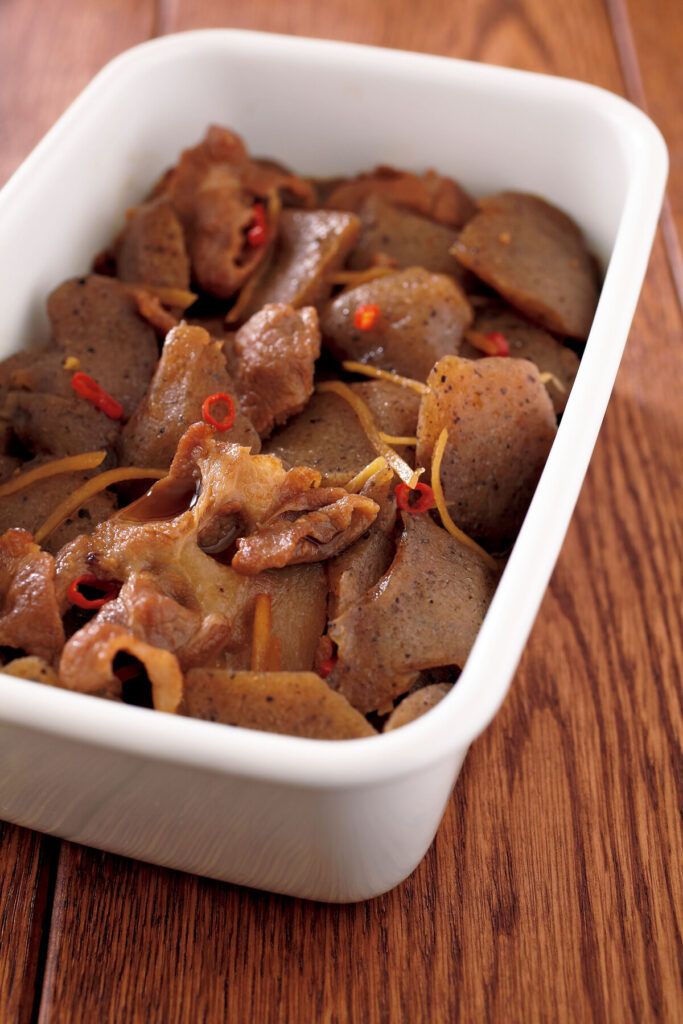 (2)フライパンにサラダ油大さじ1を中火で熱し、豚肉を入れて炒める。肉の色が変わったら、しょうがとこんにゃくを加え、2~3分炒める。全体に油が回ったら、煮汁を加えて強火にして煮立て、アクを取る。落としぶたをして強めの中火にし、ときどき混ぜながら10分ほど煮る。煮汁が1/2量くらいになったら火を止め、そのままさます。