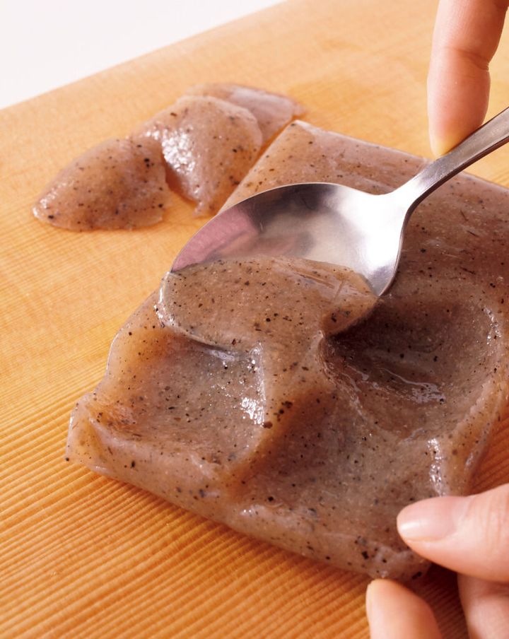 (1)こんにゃくはスプーンで薄くそぐようにちぎる。ボールに入れ、塩少々を加えてから手でよくもみ、さっと水洗いする。