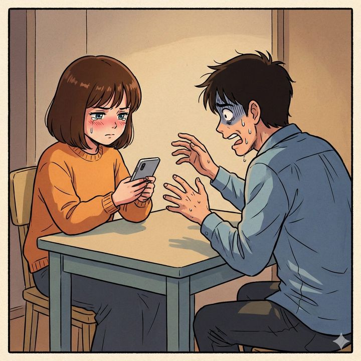 スマホを握りしめる手が微かに震えています。