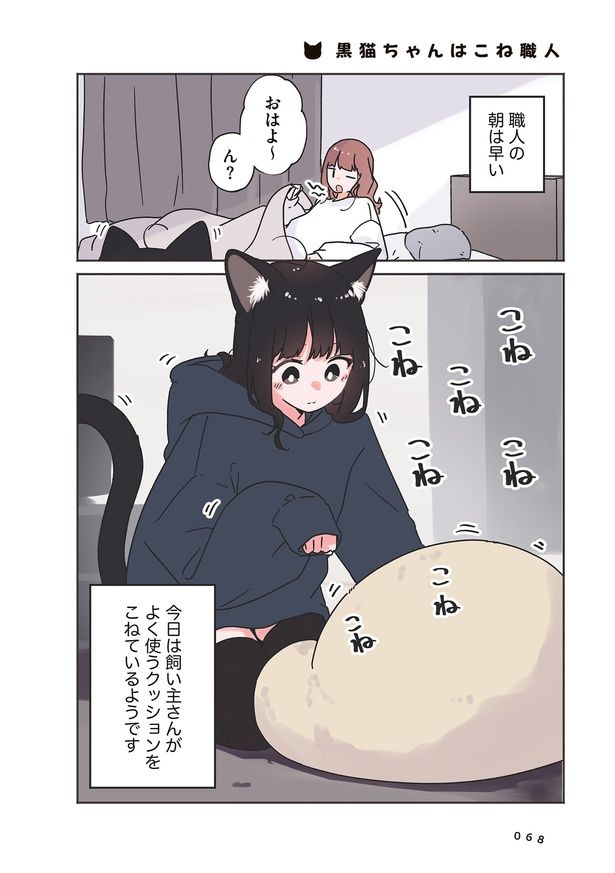 「こね」職人たちの朝は早い。朝起きると、よく使うクッションを猫がこねていて?/うちの黒猫、おんなのこ⑨