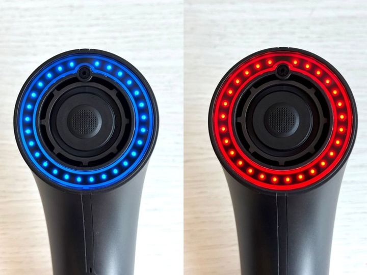 毛髪のケアのみならず、頭皮のケアもしてくれるLED搭載。右から:赤色LEDはエイジング、青色LEDはベタつきをおさえ、頭皮環境を整えてくれます。