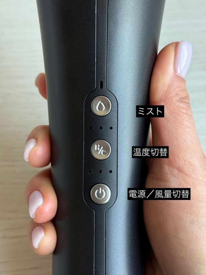 上から:<電源/風量切替>風量は「弱・中・強」の3段階。<温度切替>「低・中・高温」の3段階に「冷風」モードが。<ミスト>ミスト機能は2分間作動し、その後自動的にオフ。