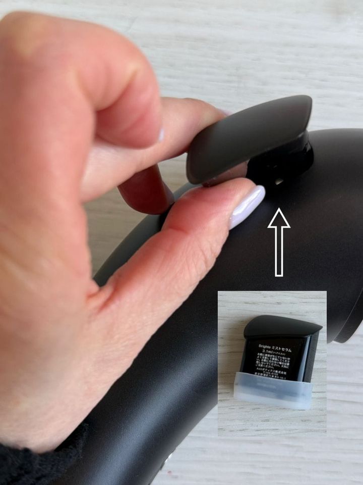 使い捨てタイプのミストカートリッジは、ドライヤー購入時1個付属されています。1日2分の使用で2か月ほどもつそう。追加のミストセラムは、オンラインで購入可能! ブライト ミストセラ< 2個セット>¥1,980(Aiロボティクス)