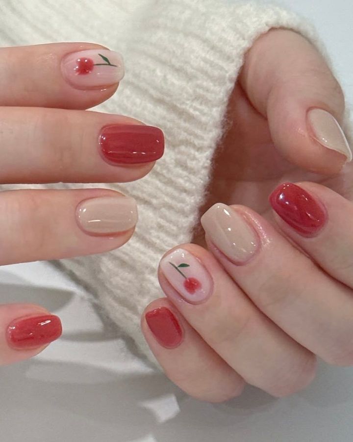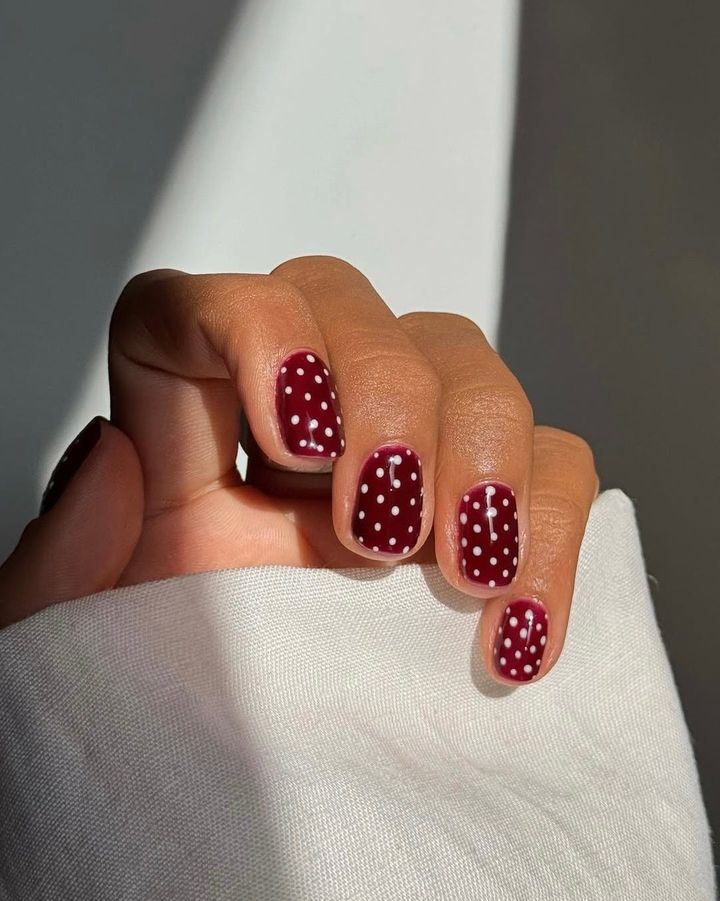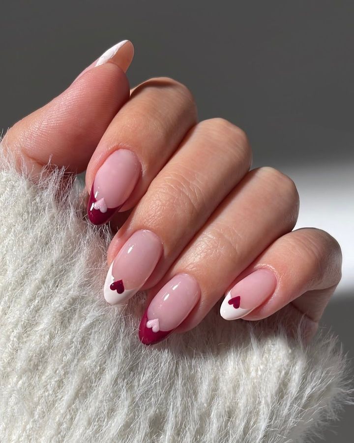 フレンチの境い目にハートをのせて愛らしく装いつつ、バーガンディでほのかに印象を引き締めて。