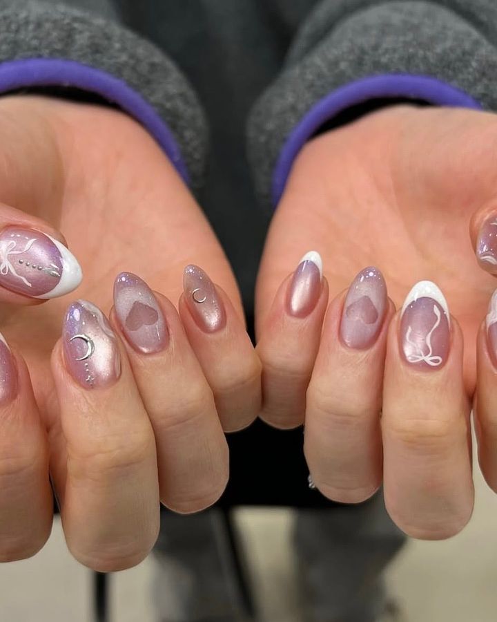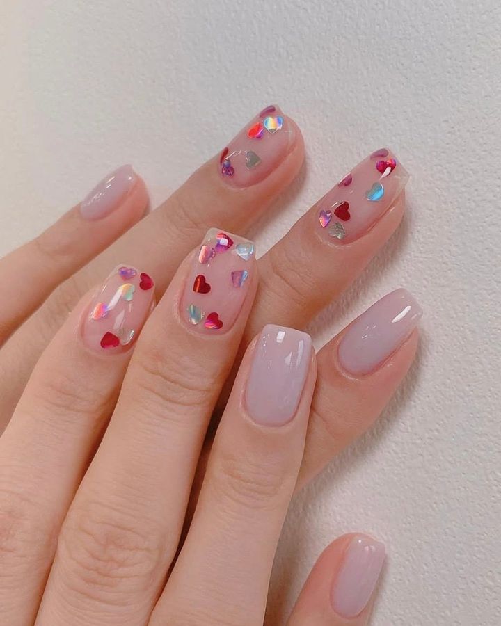 多色ハートが華やか。残りの爪は繊細で控えめなペールモーヴを選び、バランスを調整。