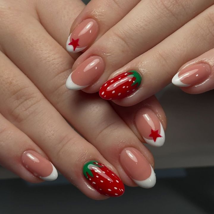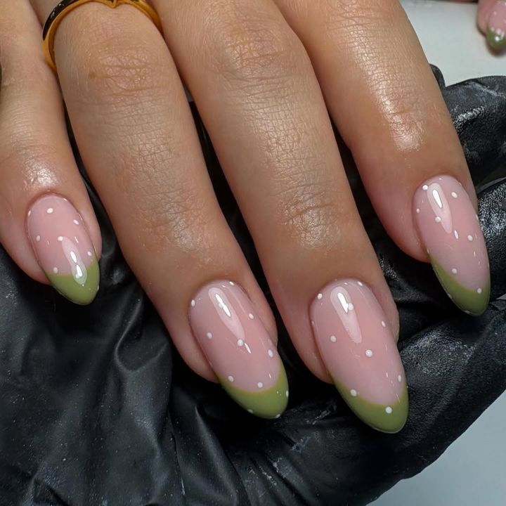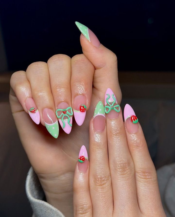 フレンチの爪先をグリーンにして、白いドットを散りばめてちょっとクールなイチゴを演出!