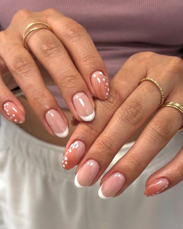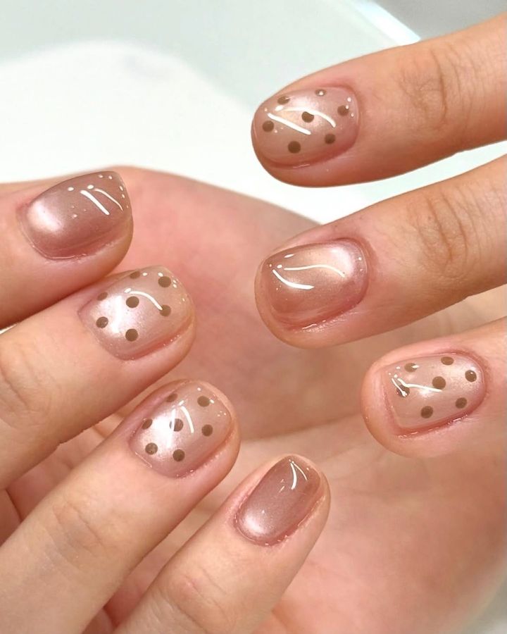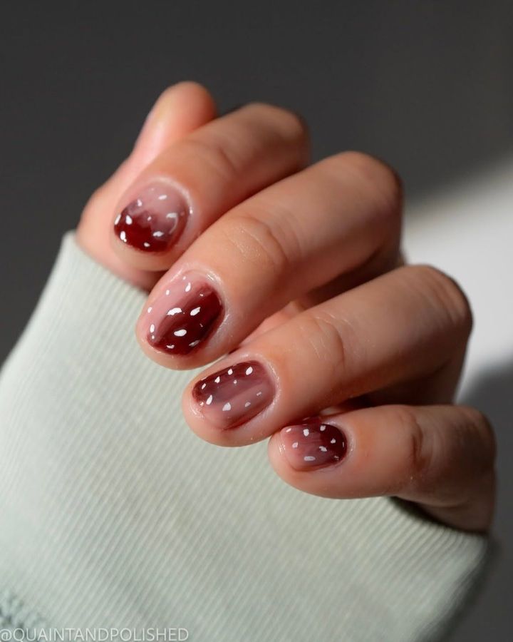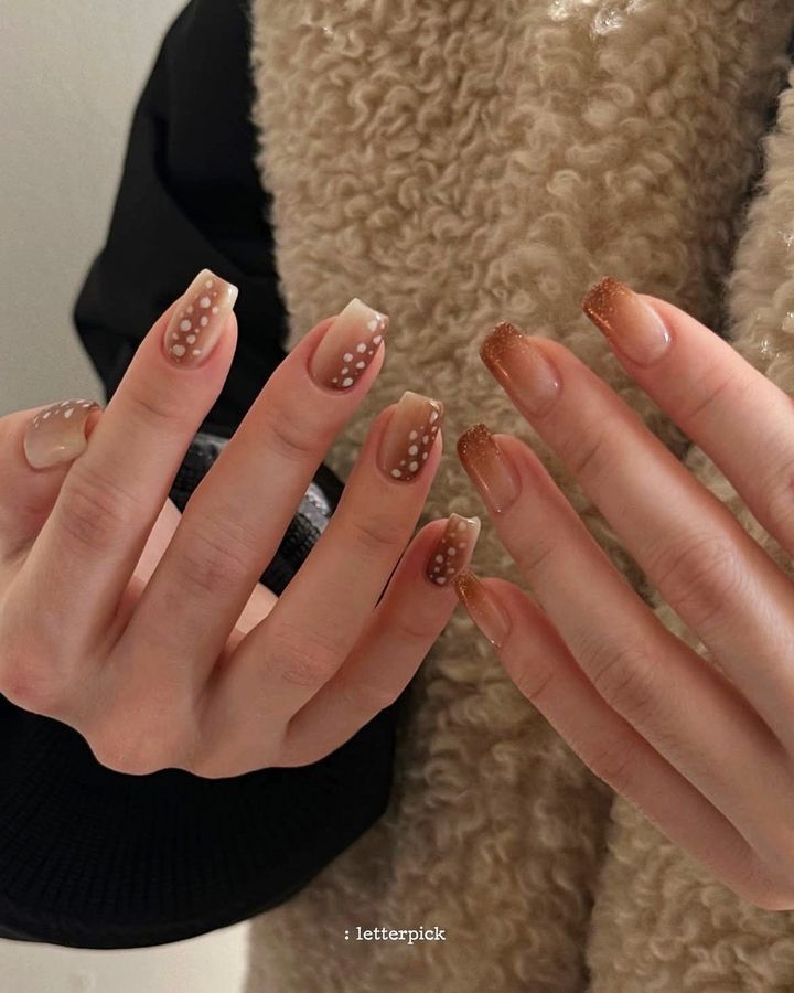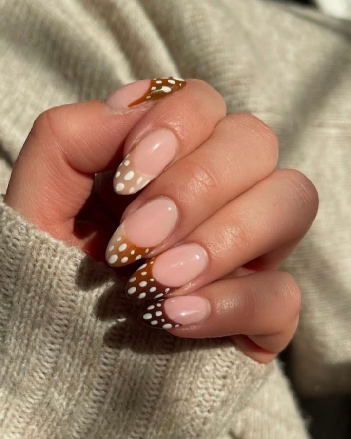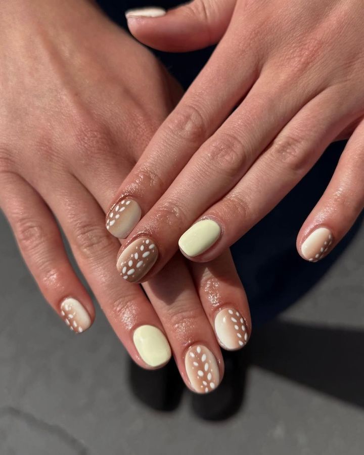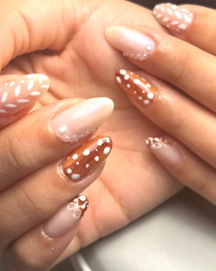 ベージュやブラウンのグラデーションに白の斑点模様を散りばめたバンビ柄のネイルがIN!