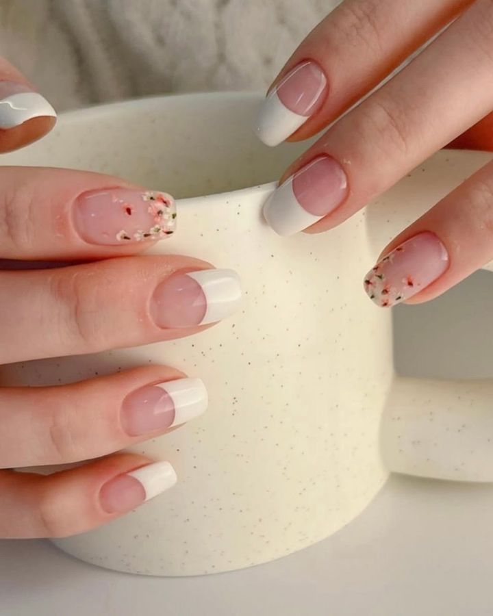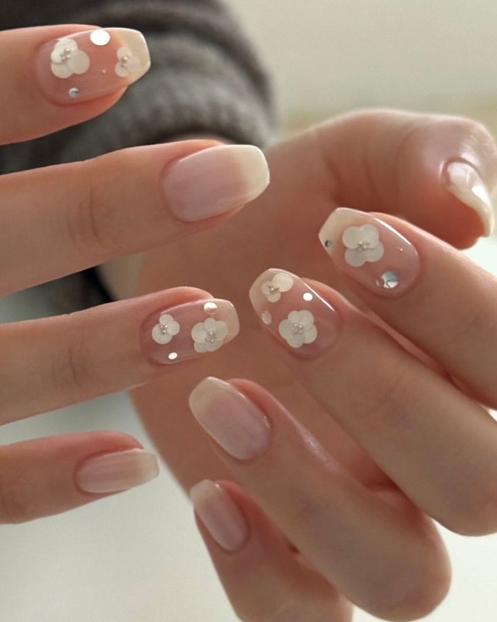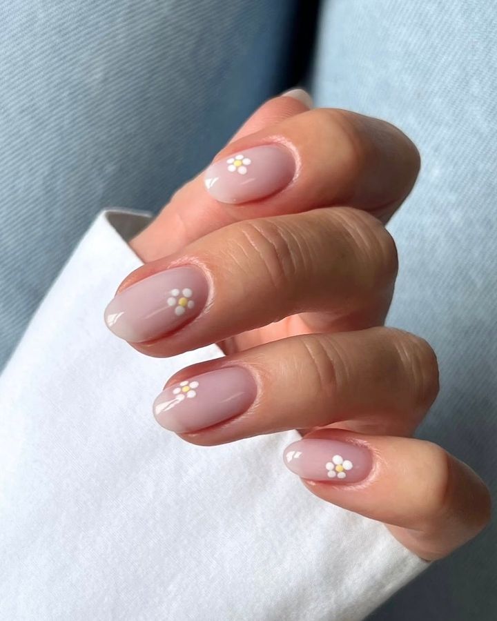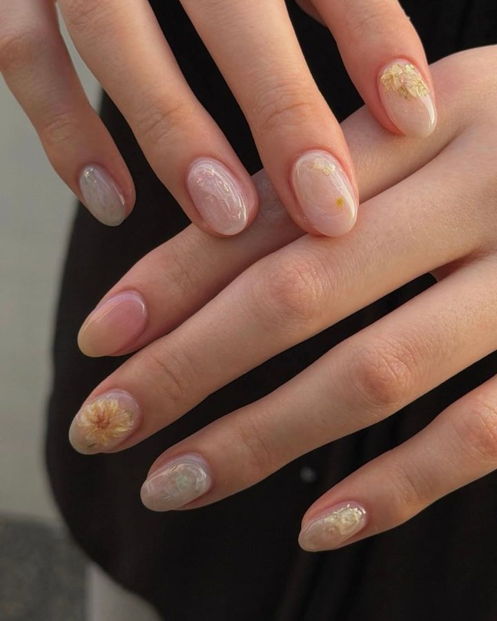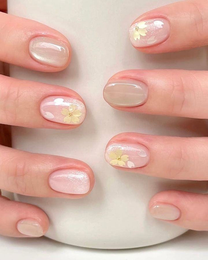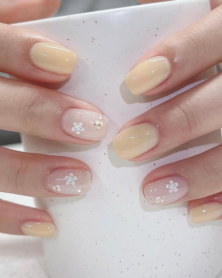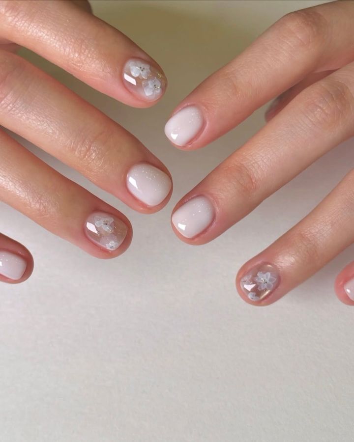 ミルキーネイルにプチフラワーをひとつずつプラス。