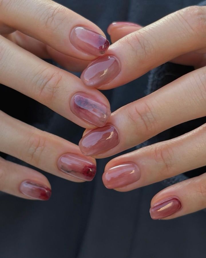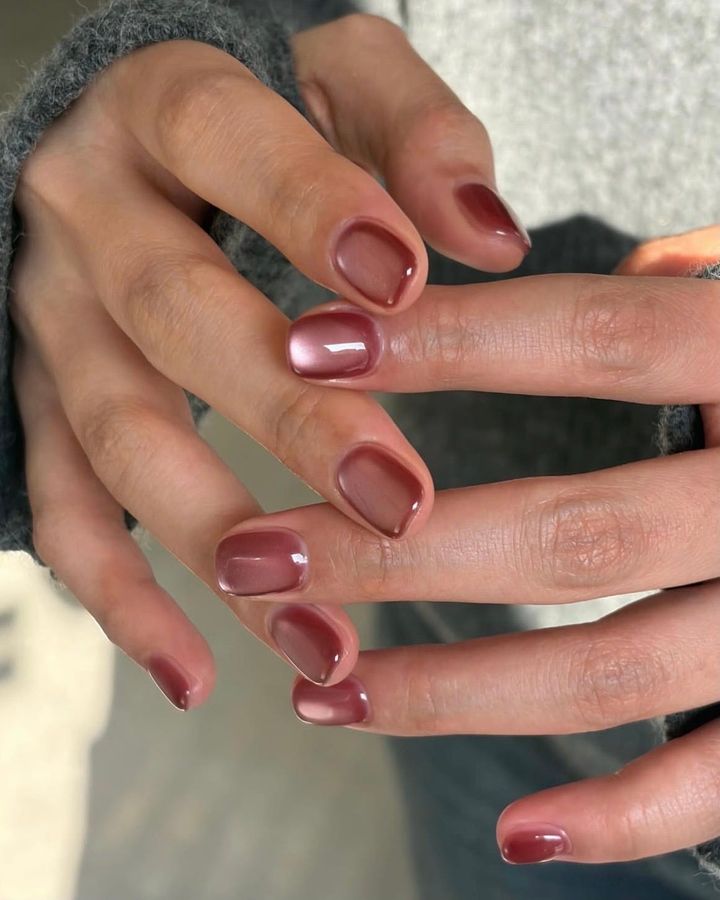 ワインシロップのような深みのあるベースでショートネイルを大人っぽく見せて。