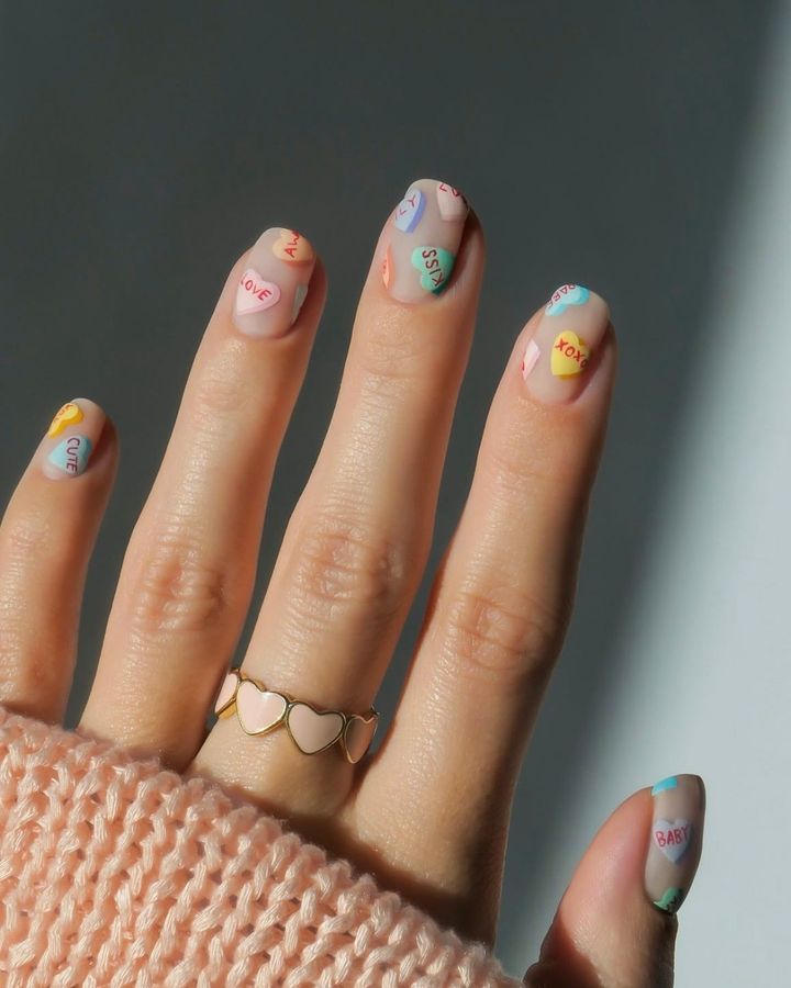 LOVEやKISSなどのレター入りパステルハートを散りばめた、ポップでキュートなデザイン。視線を集めそう。