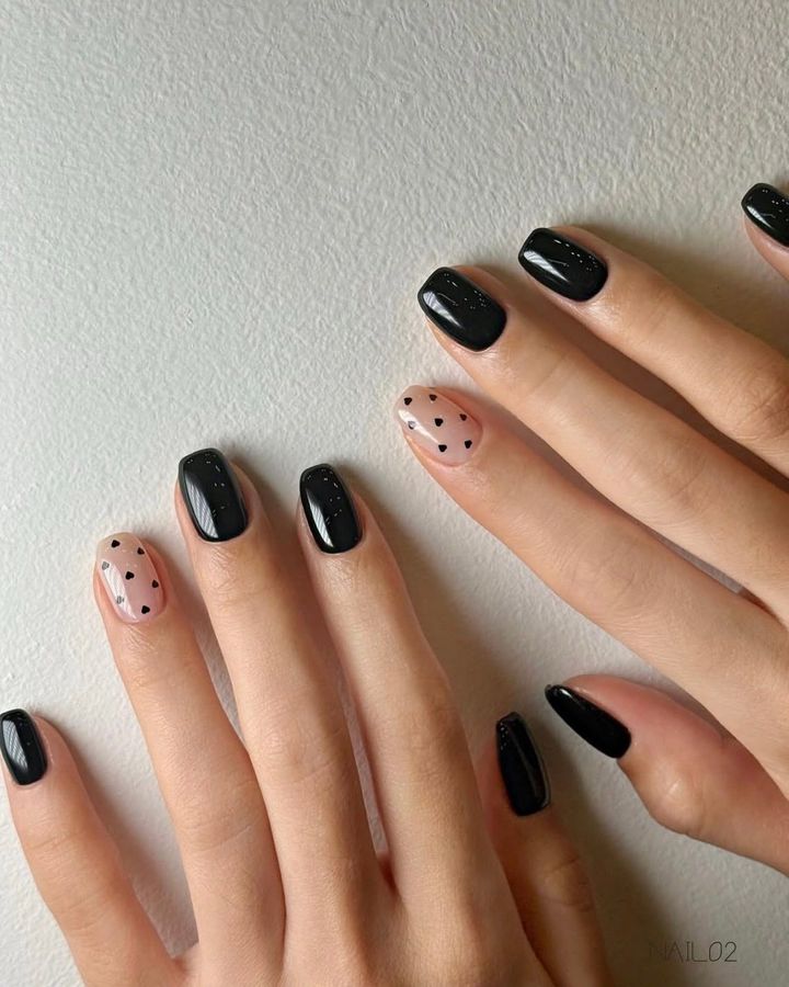 ミニハートをドット風に配置。キリっとしたブラックからのキュートなギャップが◎。