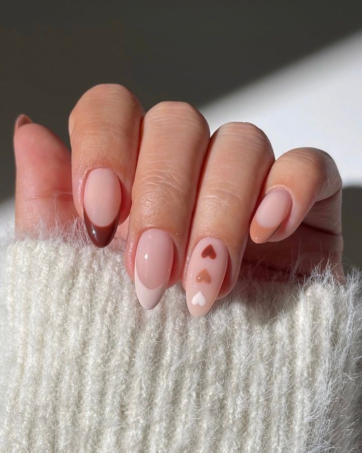 縦に並べたハートがアイキャッチー。ミルキーなブラウンからソフトピンクのリラクシングなトーンもおしゃれ。