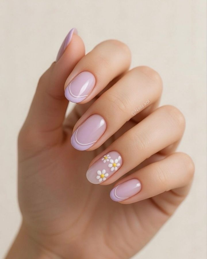 淡いラベンダーのベースにデイジー風のフラワーをあしらった、春らしいデザイン。