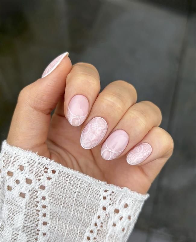 短めオーバルのかわいらしいムードに、レース柄がベストマッチ。フレンチを混ぜて適度な抜け感も。