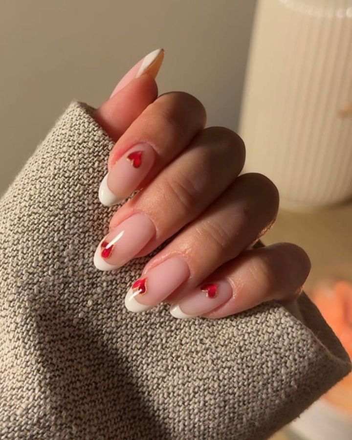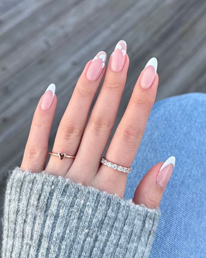 ハートの変型フレンチネイルは、ほんのりグレーズド仕上げで光沢と品を添えるのが正解。