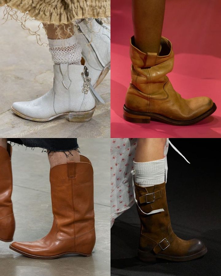 コム デ ギャルソンとミュウミュウは、ヴィンテージのようなエイジング加工が目を引く。アン ドゥムルメステールは、ウエスタンブーツに意外性のあるベルトのディテールが新しい。メゾン マルジェラは、端正なシルエットに一切の装飾を排した潔いデザインが美しい一足。