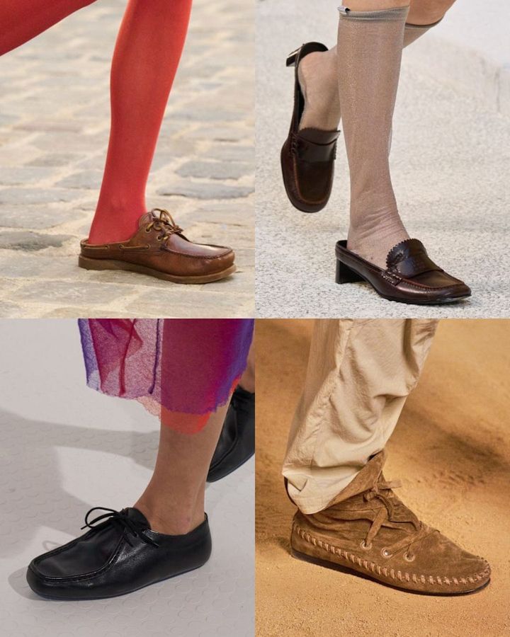 メリル ロッゲやMM6 メゾン マルジェラは、ボートシューズを解体、再構築し、まるでミュールのようなまったく新しいシューズを提案。かつての「おじさん」イメージを払拭した。イザベル マランはスエード素材を、ジルサンダーはやわらかなレザーを採用し、都会的な一足へと昇華させて。