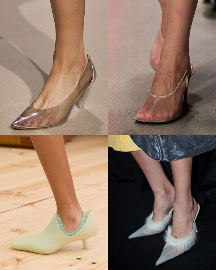 クロエは透明なストラップ使いでヌーディな美しさを引き出し、ステラ マッカートニーはエレガントなパンプスにシアー素材を用いて意外性を取り入れて。ディーゼルとロエベはPVCを大胆に使用し、シューズ界に新風を吹かせた。