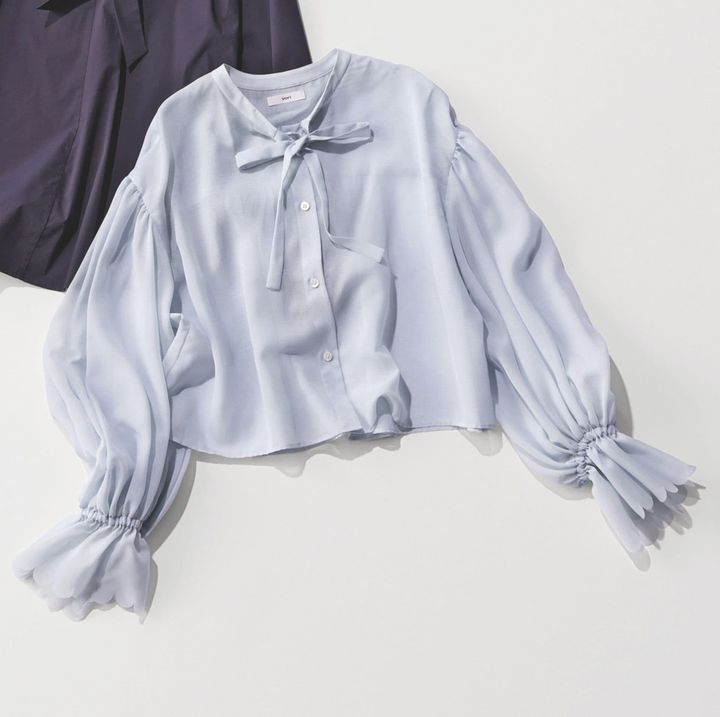 軽やかさたっぷりなパステルブルーは、1枚できれい見えする優れもの。控えめな細リボンやパフスリーブで、シンプルながらトキメキも。シャープなパンツと合わせて、上品甘ニッシュに仕上げたい。