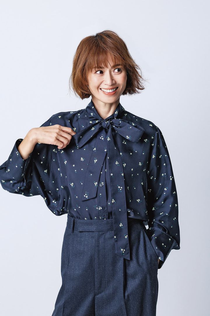 ブラウス¥49,940〈23区 GOLD LABEL〉ジャケット¥44,000パンツ¥27,500〈ともにアンクレイヴ〉(すべてオンワード樫山 お客様相談室)バッグ¥220,000(ピエール アルディ/ピエール アルディ 東京)ピアス¥35,200(マリハ)リング¥59,400(カラットアー/イセタンサローネ 東京)