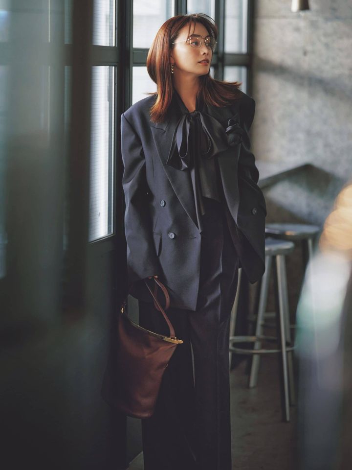 全身黒ベースのジャケットスタイルには、今っぽさと華やぎ、そしてフォーマル感を与えてくれる大ぶりリボンが正解。シックな素材感だから、子供っぽい甘さは皆無で、大人の女性らしい華やかさだけが引き立ちます。上品なビジュアルは、オフィスコーデにも活躍するはず。