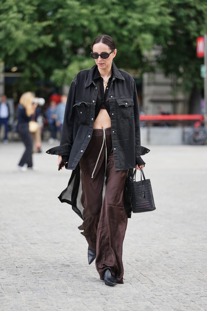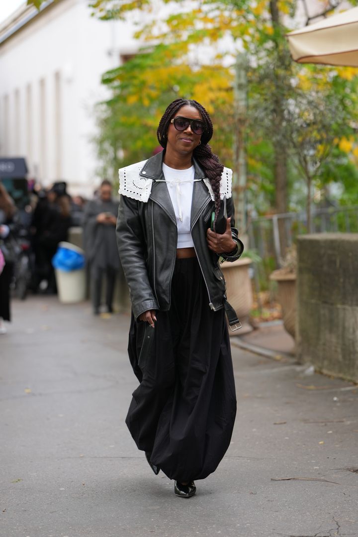 海外ファッショニスタたちの、イージーパンツをさらっと取り入れたコーデはさすが! バルーンのようにふんわりとしたフォルムのイージーパンツを、ハードなライダースジャケットと合わせたコントラストが秀逸。フェミニンな付け襟やレディなポインテッドトゥパンプスを合わせることで、隙のないおしゃれなスタイルに仕上がります。