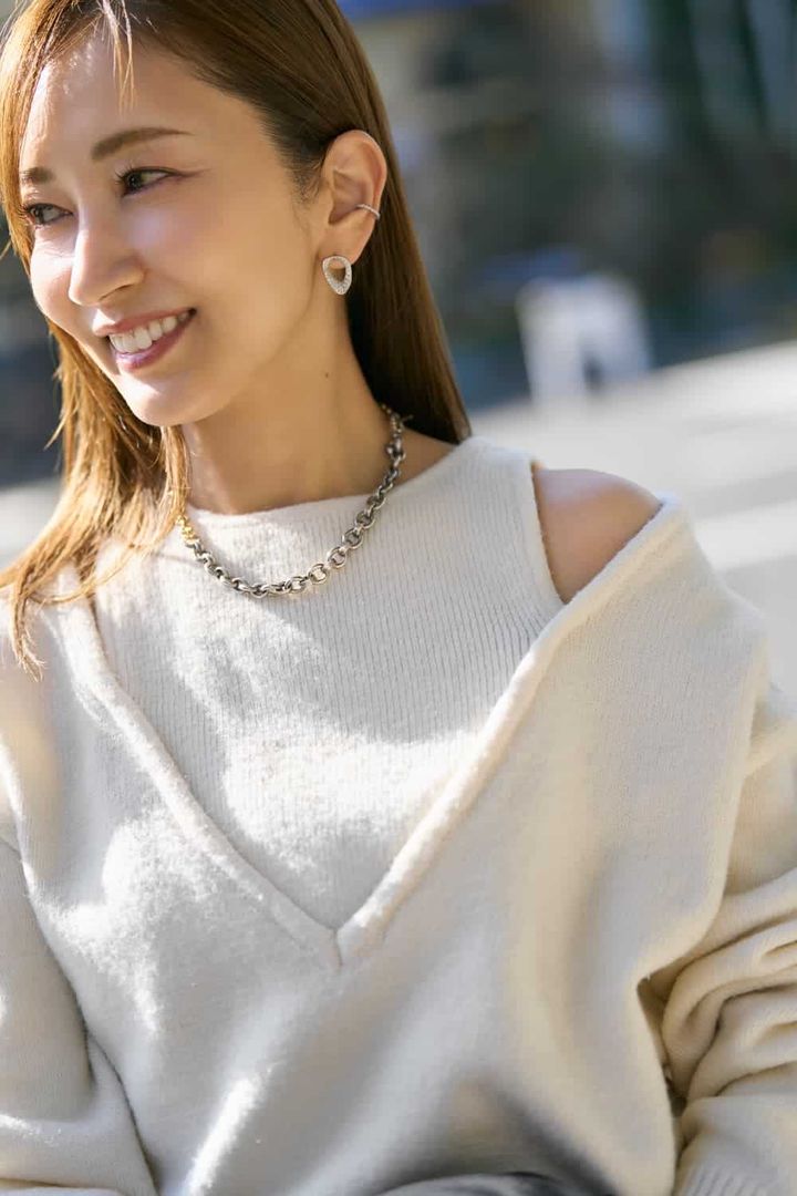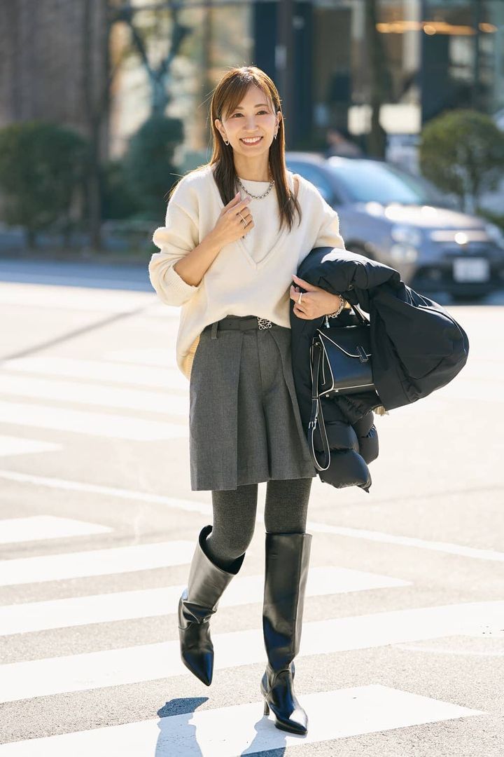 異素材切り替えのデザインで着膨れせず、ダウンでもスタイリッシュに着られるところが気に入っているケープホーンのダウン。更に防水、撥水、撥油加工の生地が使用されていて、悪天候の日でも気にせず着られる冬の最強アウターです。肩にチラリとスリットが入った白ニットで、野暮ったくなりがちなダウンコーデに抜け感を出しました。ショートパンツで動きやすさとスタイルアップも狙った、大人のキレイめカジュアルスタイルです。