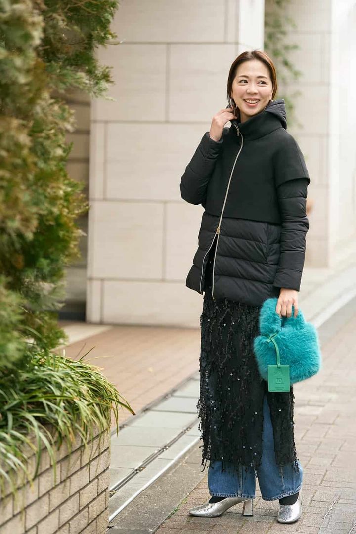 HERNOの黒ダウンはまるで短丈の半袖ジャケットをレイヤードしたように見える異素材MIXの凝ったデザインが気に入っています。ボディラインも綺麗で着膨れしにくいのも良いところ。お尻を隠して体型カバーもできるし、いろいろなボトムスと相性がいいちょうどいい丈感が助かります。黒ダウンは平凡に見えがちなので、トレンド感のあるシアースカートをデニムに重ねてモード感を演出しました。