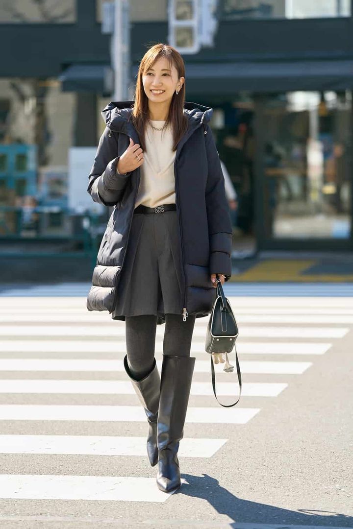 韓国で購入したノースフェイスのダウンはショート丈が今っぽくて気に入っています。子供のスポーツ送迎も多いので防寒のために欠かせないダウンですが、体が大きく見えてしまうのが玉にキズ。このダウンはしっかり暖かいのにコンパクトでスタイルよく見えるので大活躍しています。カジュアル過ぎずスカートコーデにもハマるのが嬉しい。荷物が多い日もコンパクトなダウンならアクティブに動けます!