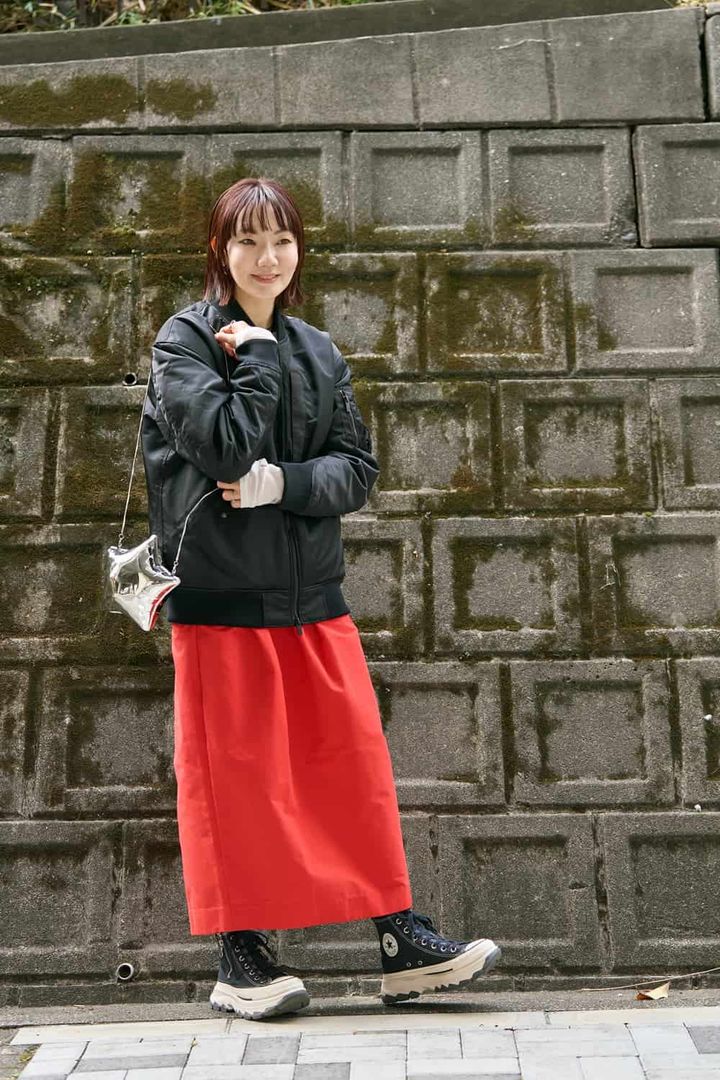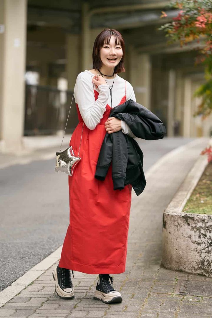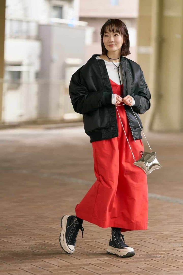 無駄を省いたシンプルな造りが気に入ったMA-1ダウンはユニクロ×ジル・サンダーコラボのもの。大きめサイズのメンズアイテムを、襟を抜いてゆるっと着たいと思って購入しました。パッと目を引く鮮やかな赤のワンピースが今日の主役!胸元のビスチェ部分はニット、スカートはジャガードという異素材切り替えのモードなデザインに惹かれました。足元はコンバースでカジュアルダウンさせ、星型のバッグで遊び心を加えました。