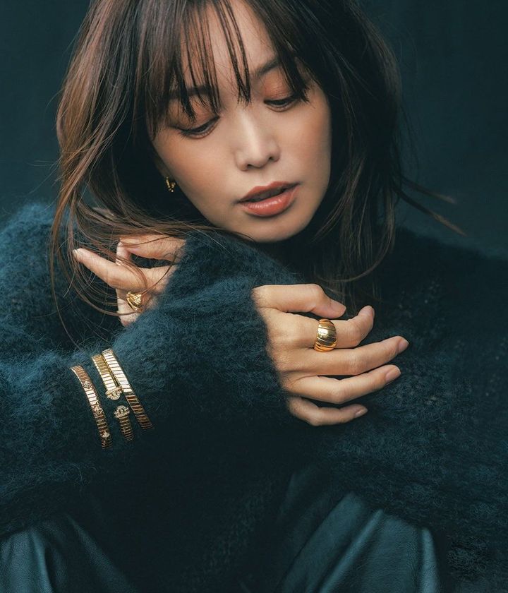 すべて「ブルガリ トゥボガス」右手ブレスレット右〈WG×YG×PG〉¥1,331,000中〈YG×Dia〉¥2,189,000左〈PG×Dia〉¥1,892,000リング「ブルガリ トゥボガス」〈YG〉¥687,500左手リング〈YG×Dia〉¥1,353,000ピアス〈YG〉¥352,000(すべてブルガリ/ブルガリ・ジャパン)ニット¥31,900(HER.)パンツ¥39,600(サクラ/インターリブ)