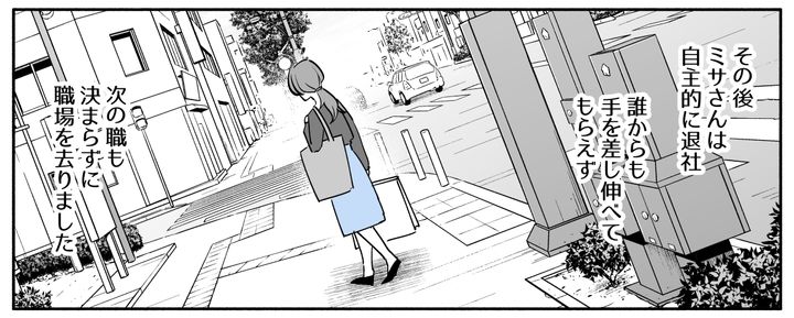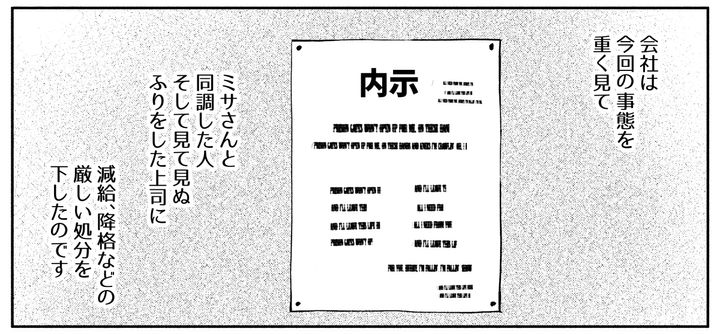 会社は今回の事態を重くとらえ、ミサさんとそれから同調した人、そして見て見ぬふりをした上司に減給、降格などの厳しい処分を下したのです。ミサさんは味方だと思っていた人からも責められ、結局、自主的に会社を去っていきました。