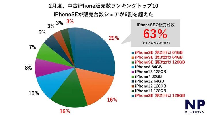 株式会社ニューズドテックによる調査によると、2025年2月の中古iPhone販売数ランキングで、iPhoneSEシリーズがトップ3を独占し、販売シェアの6割を超える結果となりました。