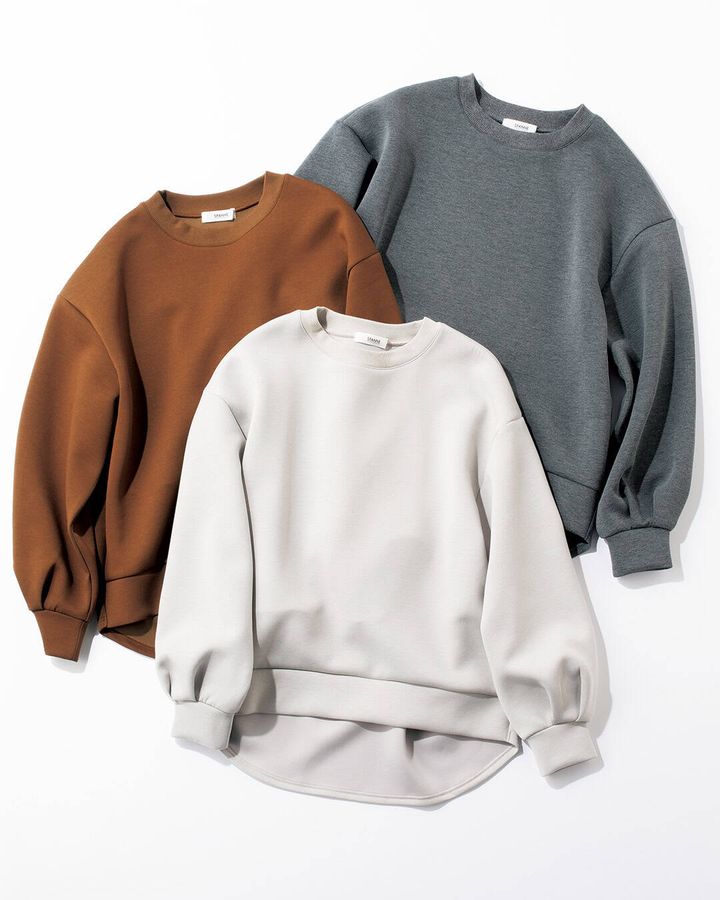 入荷するたびに完売する大ヒット中のスウェット。コクーンシルエットとボリューム袖で着るだけで今っぽくなる名品スウェット。きれいめに着られるもっちり素材も大人には最適。お腹周り、ヒップを隠す立体的デザインだから、スタイルを気にせず着こなせます。パンツももちろん合うけれど、特にスカートと相性抜群!春の初めましてのママ友ランチにも着ていける好感度が魅力です。