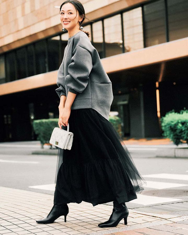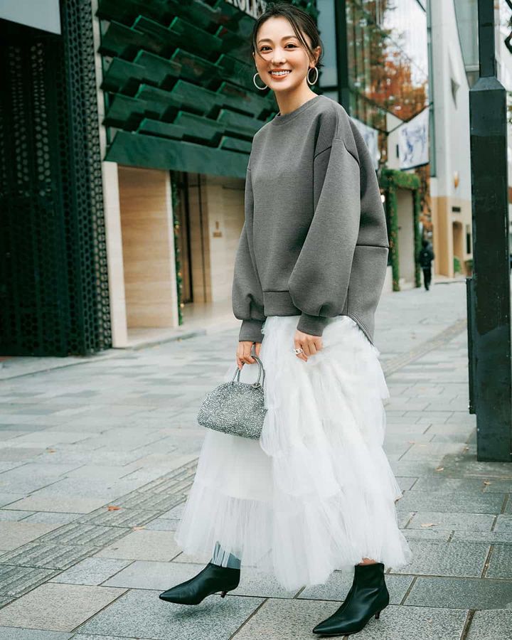 ➀ふんわりスカートを合わせれば一気にお出かけ仕様になる「オーバーサイズスウェット」