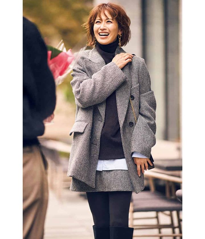 【コーデすべて】ジャケット¥132,000ミニスカート¥49,500(ともにカオス/カオス丸の内)ニット¥10,450(Mila Owen/Mila Owen ルミネ新宿2店)シャツ¥25,300(アンクレイヴ/オンワード樫山 お客様相談室)バッグ¥44,000(ケイト・スペード ニューヨーク/ケイト・スペード カスタマーサービス)ブーツ¥121,000(ダブルスタンダードクロージング/フィルム)ピアス¥66,000(ブランイリス/ブランイリス トーキョー)タイツ¥2,090(靴下屋/タビオ)