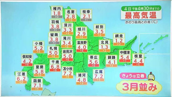 午後4時半までの最高気温は各地でプラスで、札幌は5度ちょうど、函館7.1度、旭川と倶知安は24日ぶりにプラスの気温になりました。