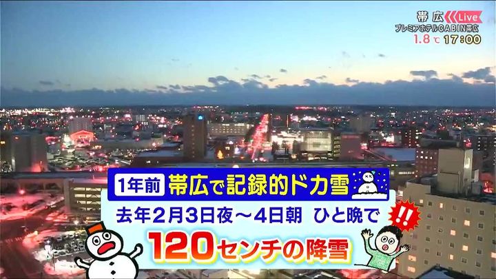 1年前のきょう4日(水)、帯広では記録的なドカ雪になりました。去年の2月4日朝にかけての「ひと晩」で観測史上最大となる120センチの雪が降りました。原因は低気圧と高い海水温の影響でした。あす5日(木)も低気圧が近づきますが、極端な大雪にはならない見込みです。