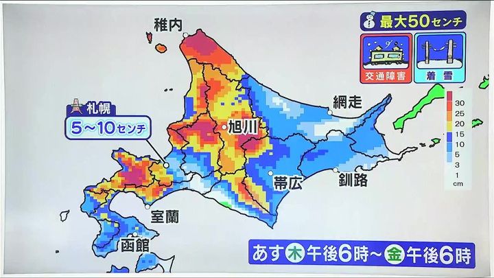 札幌や東部は5~10センチのところが多いですが、赤や紫のエリア、稚内や旭川など道北や空知、後志地方で30センチ前後、局地的に50センチの大雪です。しだいに風も強まるため、猛吹雪による交通障害に警戒、湿った雪による着雪に注意して下さい。