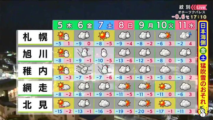 金曜は道南方面でふぶくでしょう。道東はしだいに晴れますが、金曜は風が強まります。土日は徐々に雪や風は弱まりますが、最高気温でも‐4度前後と寒さが厳しくなるでしょう。