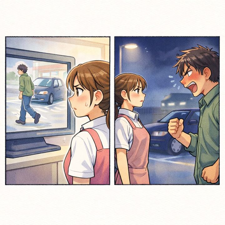 「はあ?朝、ちゃんと買い物しただろ。1品でも買えば客なんだから、いつまで停めてようが勝手だろ。そんなことも分からないのかよ」