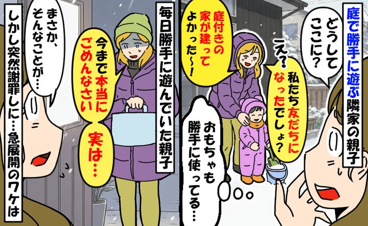 勝手に庭で遊ぶ隣家の親子「庭付きの家が建ってよかった〜!」後日急に菓子折りを持って謝罪…一体何が