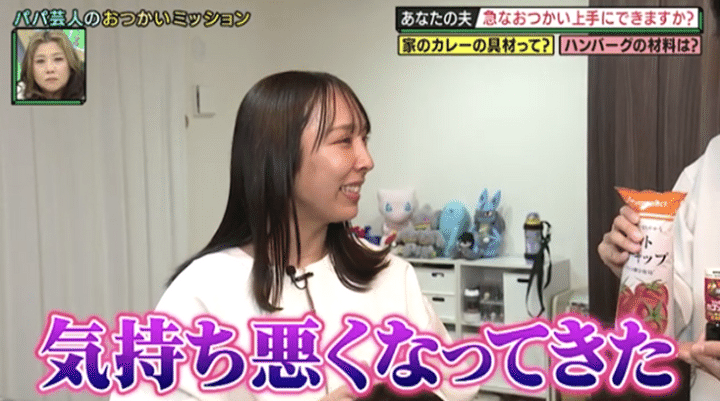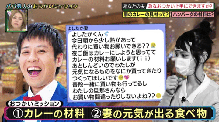1人目の夫、結婚10年目のスマイル・ウーイェイよしたかに妻が頼んだのは「カレーの材料」と「私の元気が出る食べ物」。おつかいは初めてではないようだが、「奥さんに“片栗粉買ってきて”って言われて聞き間違えて、“カプリコ”買ってきて怒られたことがある」と信じられないミスを過去にやらかしているらしく、浜田は不安を募らせるが…。