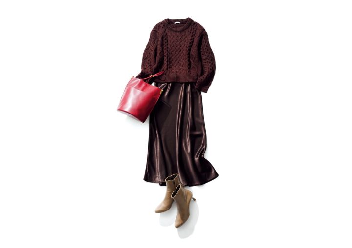 サテンスカート¥5,000/Olu. ケーブルニット¥2,990/GU ショルダーバッグ¥6,490/カシュカシュ(アンビリオン) ショートブーツ¥31,900/ダイアナ(ダイアナ 銀座本店)