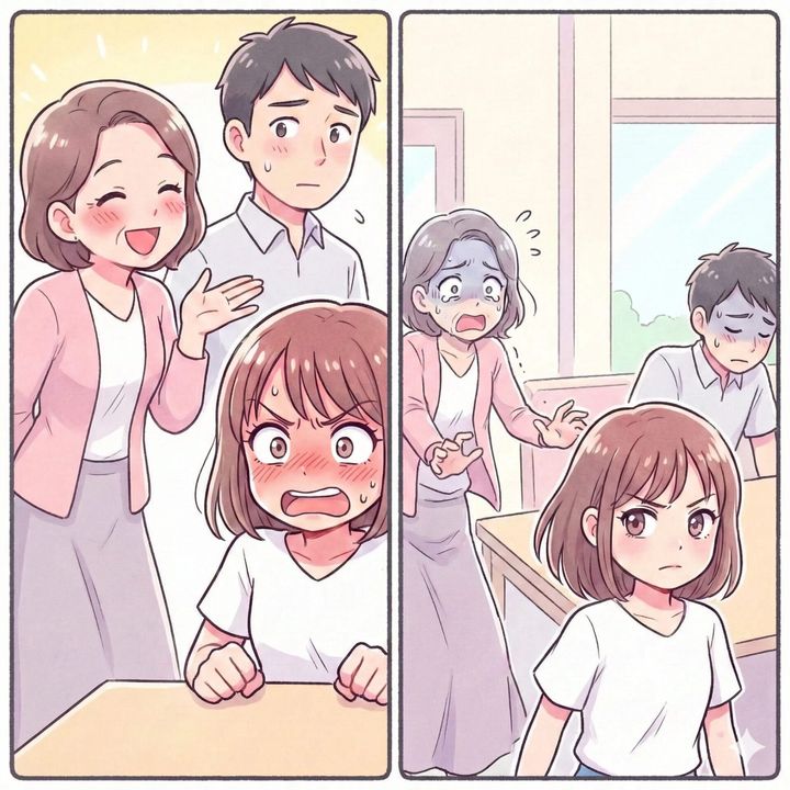 母は言葉を失い、隣の男性は気まずそうに目を逸らしました。