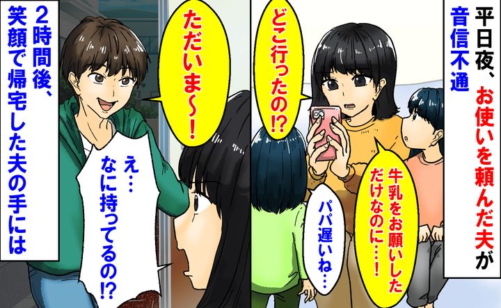 「牛乳買ってきて!」平日夜、お使いを頼んだ夫が音信不通に。近所なのに!2時間後、笑顔で帰宅した夫の手には