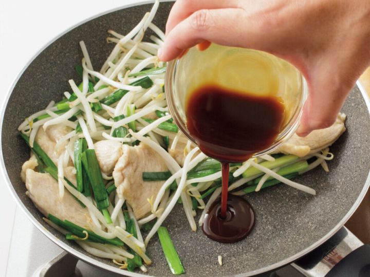 (2) フライパンにごま油大さじ1と鶏肉を入れて中火にかけ、肉の色が変わったら裏返し、もやし、にらを加えて1分焼く。さっと混ぜて手前をあけ、〈A〉をもう一度混ぜて加え、全体を炒め合わせる。